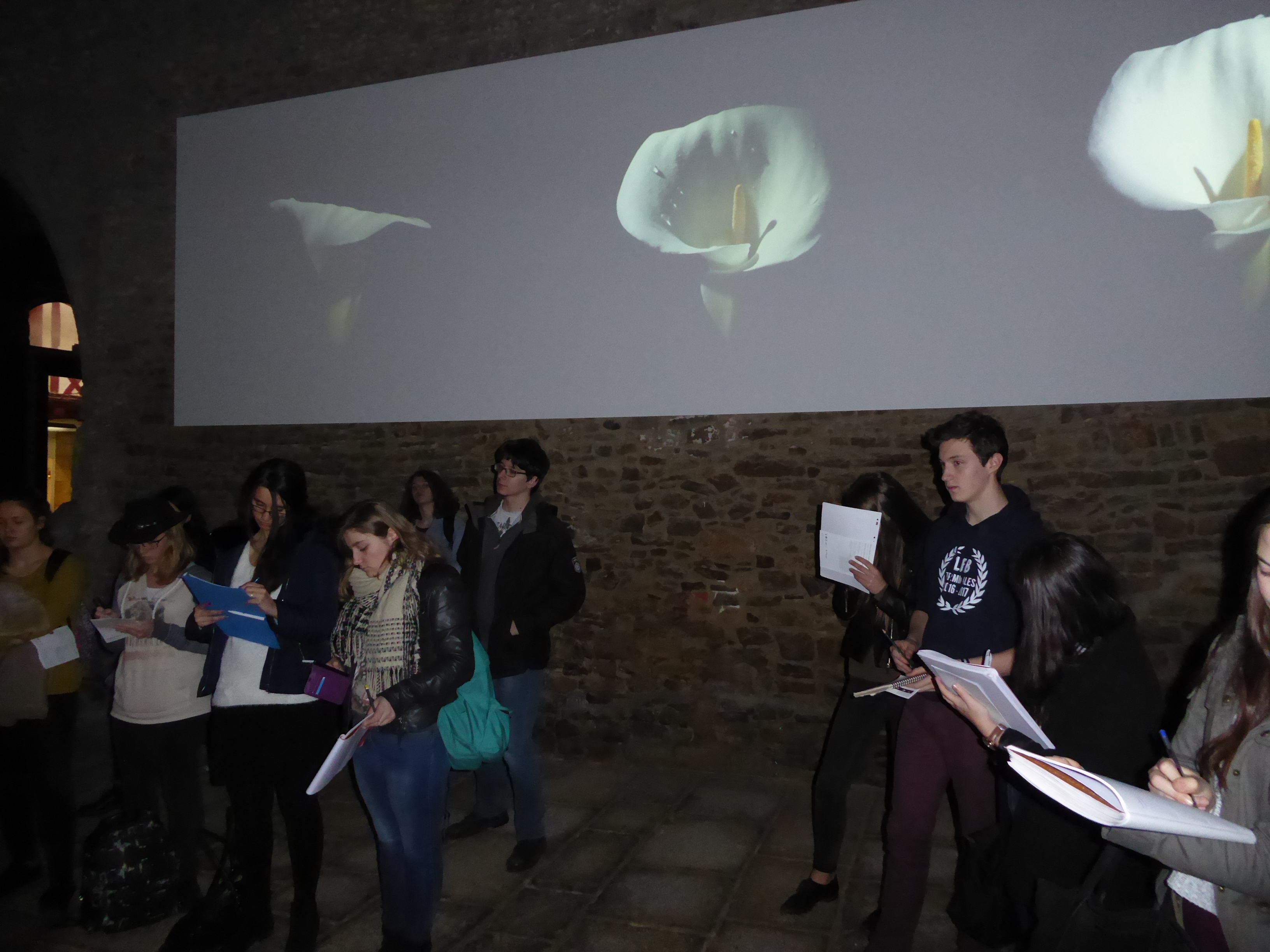 les élèves devant l’œuvre vidéo de Jean-Marc Ségalen.